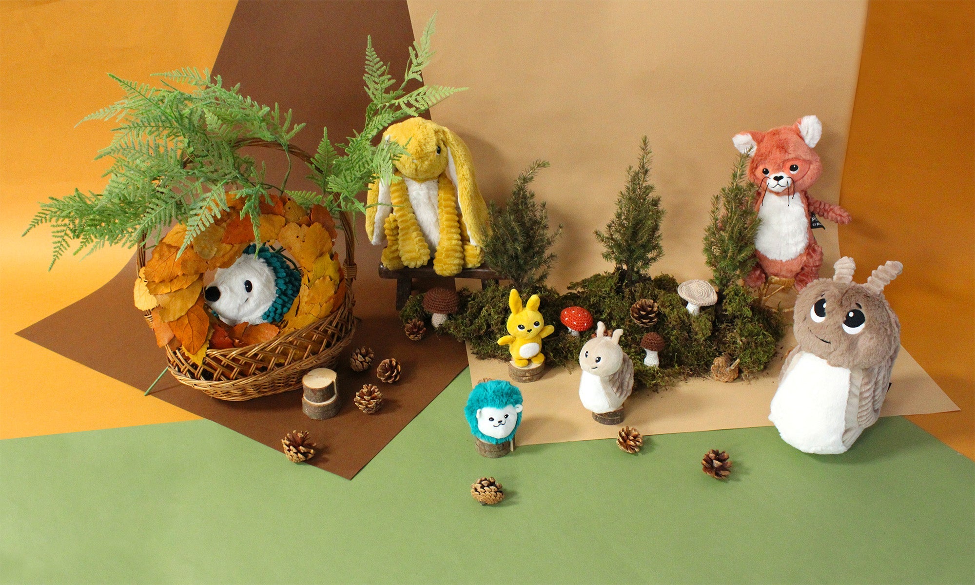 Les peluches collection Forêt Ptipotos comprend des animaux de la forêt tels que les lapins, escargots, hérissons, ratons laveurs,...