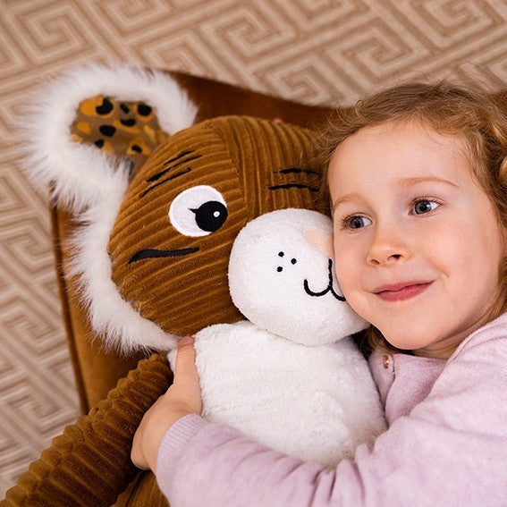 Avec un géant, votre kids aura un nouveau potos de sa taille ou même plus grand que lui ! Speculos le tigre pourra lui faire des câlinos de folie avec ses grandes pattes ! La peluche géante toute douce en velours côtelé est marron et colorée. Assise, la peluche géante mesure 60 cm. Top aussi pour apporter un côté déglingué à la déco de la chambre. Complètement foldingos mais tellement classos !