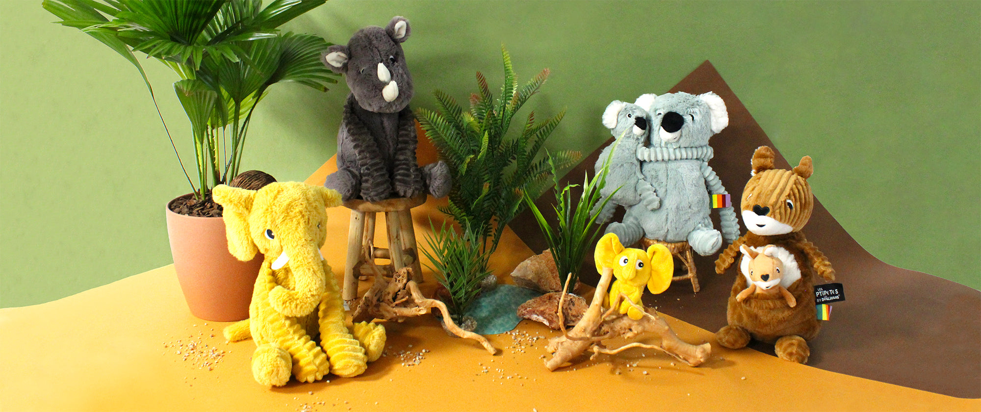The Wild Ptipotos collection of plush toys includes wild animals such as elephants, rhinos, koalas, kangaroos, and more.