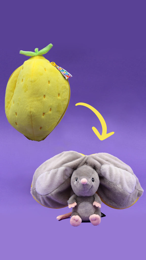 The lemon plush unzips and becomes a mouse.