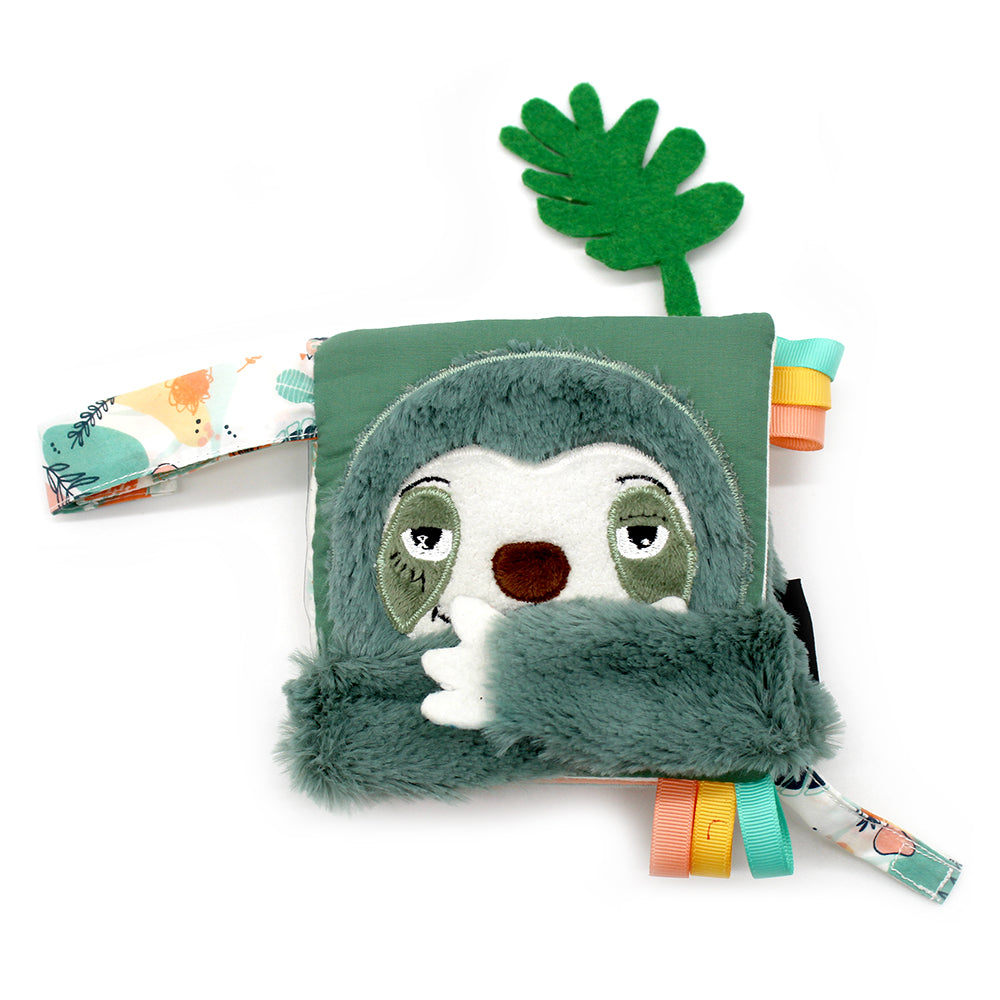 A fun soft book about Chillos the sloth! With its rustling paper, its velcro, its mirror, its teething ring and its different materials, it awakens the senses and entertains baby.