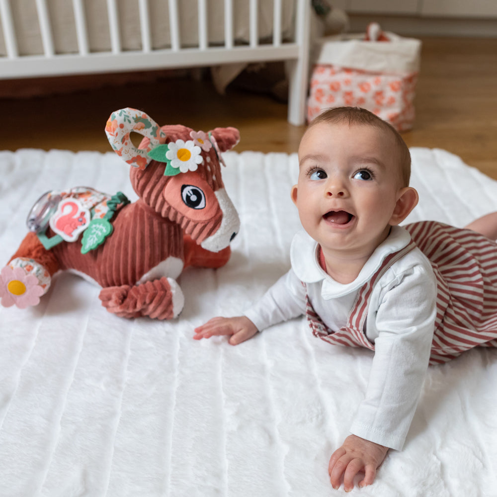 La peluche d'activités rouge terracotta Mélimélos la biche est un jouet d'éveil pour bébé. Elle éveille tous ses sens grâce à sa queue vibrante, son grelot, miroir et anneau de dentition.