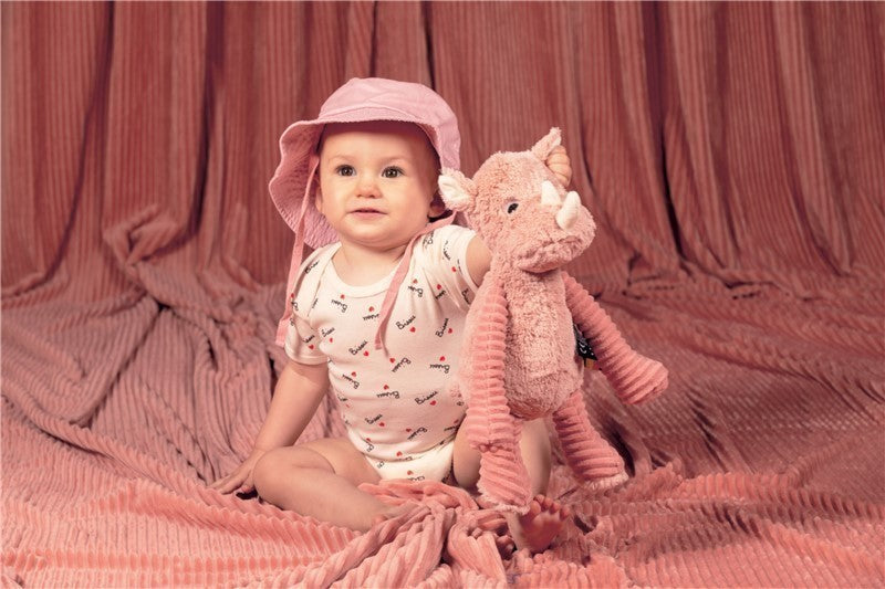 Cette peluche rhinocéros rose de 35 cm est en velours côtelé et soft tout doux.